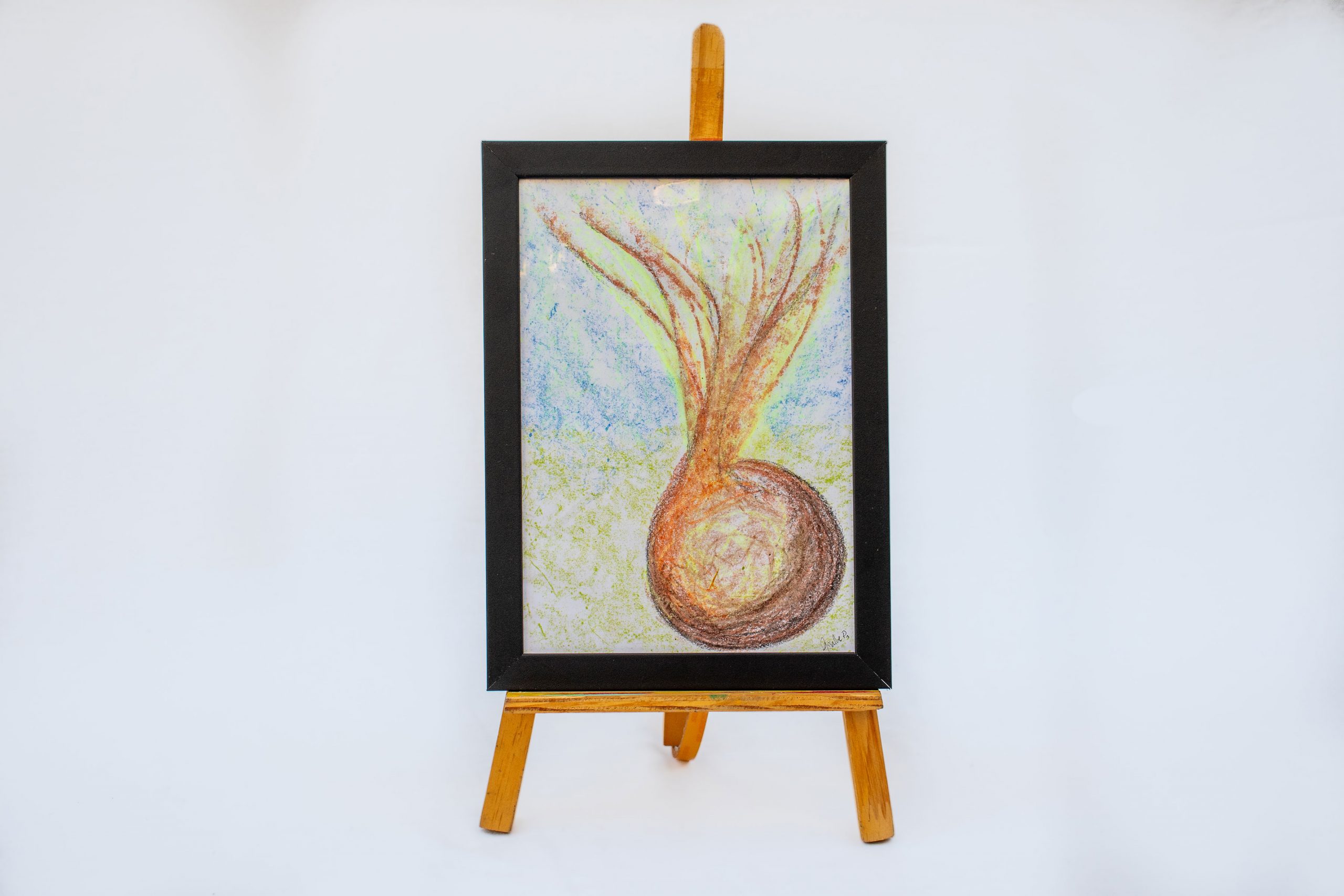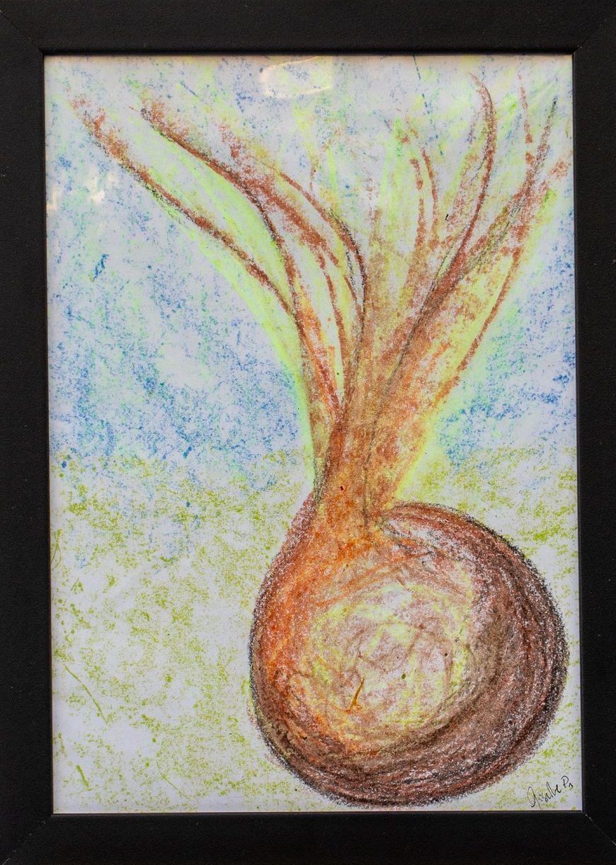 Desenho de Giselle Pacheco feito com giz de cera sobre papel sulfite emoldurado com vidro.
